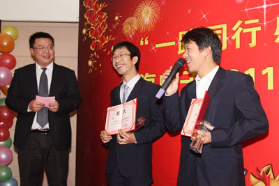 工作報告結束、短暫休息后,我們的主持人帶著大家進入了議程中令人興奮與激動的優秀員工表彰及員工精神傳送時刻。企業要發展就得要有創新,今年公司結合傳統的評選方式,也同時啟動了新的評選方式:2011年度共設置5個獎項,評選出7名優秀員工、1個優秀團隊。